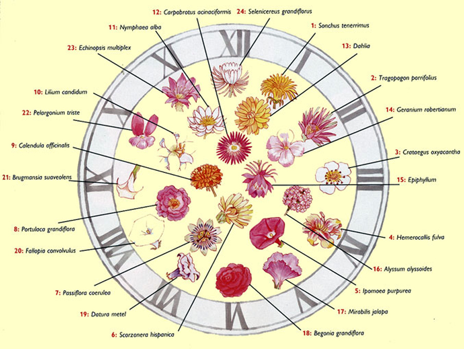 Osservare la natura delle specie vegetali e animali che popolano il pianeta (e quindi la fioritura delle piante) è stata la missione della vita di Carolus Linneo, medico e naturalista svedese, che ha fondato la moderna tassonomia e nel 1735 ne ha definito i criteri di classificazione introducendo la nomenclatura binomiale, un metodo usato ancora oggi, in base al quale ogni organismo viene munito di due nomi di origine latina: il primo relativo al genere di appartenenza (il cosiddetto nomen genericum), e il secondo relativo alla specie propriamente detta. Ma non si limitò, se si può dire, a questo: studiò nel 1751 un orologio floreale che riuscisse a scandire il tempo grazie ai fiori che sbocciano nell’arco delle 24 ore, disponendo al posto dei numeri i fiori, in considerazione dei diversi momenti di apertura delle corolle. Cosi realizzò in un prato a Uppsala, in Svezia, il primo orologio dei fiori: un’aiuola rotonda col quadrante diviso in dodici spicchi colorati da piante diverse, il cui margine d’errore al massimo può arrivare a mezz’ora.