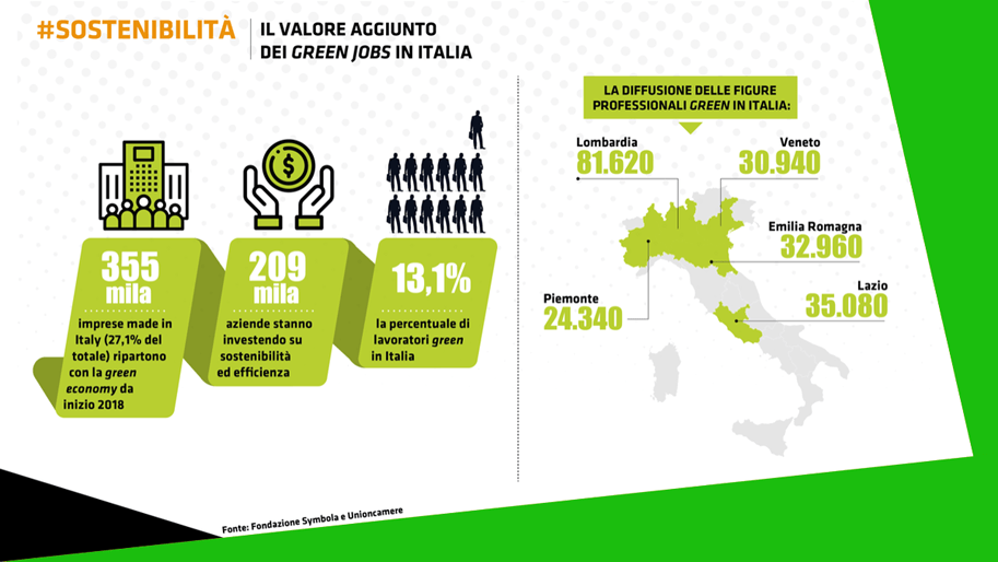 Oggi dunque quello che può fare la differenza per le imprese italiane sono le competenze “verdi”, sempre più richieste in maniera trasversale in ogni settore: nel 2018, 3,6 milioni posizioni di lavoro, il 78,8% di tutti contratti programmati dalle aziende italiane per quell’anno, erano destinate a persone che potevano vantare competenze green. In Italia sono infatti ormai più di 3 milioni i “Green Jobs”, il 13,4% degli occupati, con 432mila imprese che, negli ultimi 5 anni, hanno investito sulla green economy per superare la crisi (Fonte: Rapporto Greenitaly 2019). E il trend di crescita non dà segno di voler rallentare, se si considera che nel 2019 sono stati stipulati quasi 522.000 contratti di assunzione relativi a nuovi green jobs, di cui il 46% a tempo indeterminato.