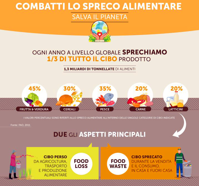 Produrre il cibo che noi sprechiamo richiede terra, acqua, manodopera e altre risorse preziose: 3% del consumo di energia, 1,2 miliardi di metri cubi di acqua dolce sprecata, 230.000 tonnellate di azoto immesso nell’ambiente. Il costo economico di questo spreco è stimato in 13-16 miliardi di euro. Secondo l’ultimo report della FAO “The State of Food and Agricolture”, a livello globale circa il 14% degli alimenti va perso dopo il raccolto e ancor prima di arrivare alla vendita al dettaglio, nel corso delle operazioni svolte nelle aziende agricole, in fase di stoccaggio e durante il trasporto.