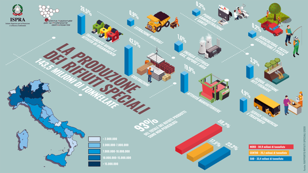 Si registra anche una crescita della produzione dei rifiuti speciali in Italia: gli ultimi dati disponibili indicano che la produzione aumenta del 3,3% (circa 4,6 milioni di tonnellate) arrivando a superare 143 milioni di tonnellate. I rifiuti non pericolosi, che rappresentano il 93% del totale di quelli prodotti, crescono di oltre 4 milioni di tonnellate (+3,3%), mentre quelli pericolosi di 376 mila tonnellate (+3,9%).