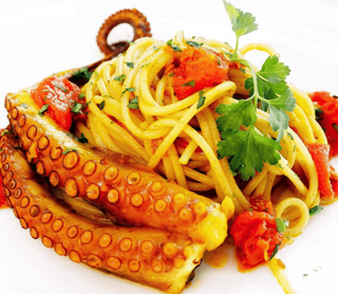 Con l’aiuto di un forchettone e un mestolo formare un nido, mettere affianco al nido di pasta i due tentacoli interi e finite con una fogliolina di prezzemolo. Gli spaghetti con polpo e pomodorini piccadilly è pronto per essere gustato.