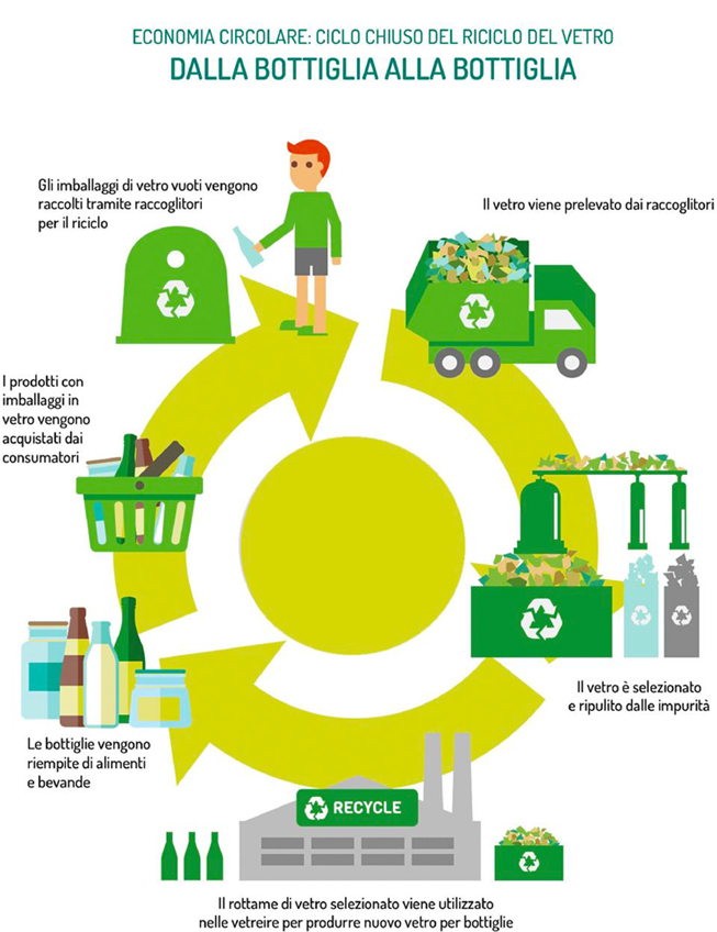 Fatto di minerali abbondanti in natura – sabbia, carbonato di sodio, vetro riciclato e pietra calcarea – il vetro è un riconosciuto leader nella circolarità, infinitamente riciclabile, con un tasso di raccolta differenziata per il riciclo del 76% in Europa. In Italia, nel 2019, il tasso di riciclo è del 77,3%, equivalente ad un tasso di raccolta differenziata dell’87%. La produzione di imballaggi in vetro per alimenti, bevande, farmaci, profumi e cosmetici, con un materiale riciclabile, riutilizzabile e permanente all’infinito si traduce in un minor consumo di risorse naturali, meno sprechi e un minor uso di energia. Attraverso la virtuosa pratica del riciclo del vetro, in UE ogni anno vengono risparmiate oltre 12 milioni di tonnellate di materie prime e si evitano oltre 7 milioni di tonnellate di CO2, (che equivale a togliere 4 milioni di auto dalla strada). Si risparmia inoltre il 2,5% di energia e il 5% di CO2 per ogni 10% di vetro riciclato nel forno.