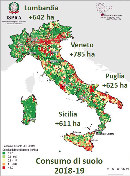 Regioni e Comuni: Il Veneto, con +785 ettari, è la regione che nel 2019 consuma più suolo (anche se meno del 2017 e del 2018), seguita da Lombardia (+642 ettari), Puglia (+625), Sicilia (+611) ed Emilia-Romagna (+404). A livello comunale, Roma, con un incremento di suolo artificiale di 108 ettari, si conferma il comune italiano con la maggiore quantità di territorio trasformato in un anno (arrivando a 500 ettari dal 2012 ad oggi), seguito da Uta (Cagliari; +58 ettari in un anno) e Catania (+48 ettari). Va meglio a Milano, Firenze e Napoli, con un consumo inferiore all’ettaro negli ultimi 12 mesi (+125 ettari negli ultimi 7 anni a Milano, +16 a Firenze e +24 a Napoli nello stesso periodo). Torino, dopo la decrescita del 2018, non riesce a confermare il trend positivo e nell’anno di riferimento, riprende a costruire, perdendo 5 ettari di suolo naturale.
