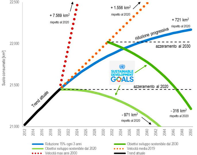 Una valutazione degli scenari di trasformazione del territorio italiano, nel caso in cui la velocità di trasformazione dovesse confermarsi pari a quella attuale anche nei pros-simi anni, porta a stimare il nuovo consumo di suolo in 1.556 km2 tra il 2020 e il 2050. Se invece si dovesse tornare alla velocità massima registrata negli anni 2000, si arriverebbe quasi a 8.000 km2. Nel caso in cui si attuasse una progressiva riduzione della velocità di trasformazione, ipotizzata nel 15% ogni triennio, si avrebbe un incremento delle aree artificiali di 721 km2 prima dell’azzeramento al 2050.