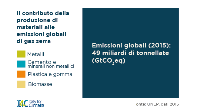 Secondo l’UNEP la produzione di materiali è responsabile di quasi un quarto delle emissioni globali, pari a 11,5 miliardi di tonnellate di CO2 equivalente (dati 2015).