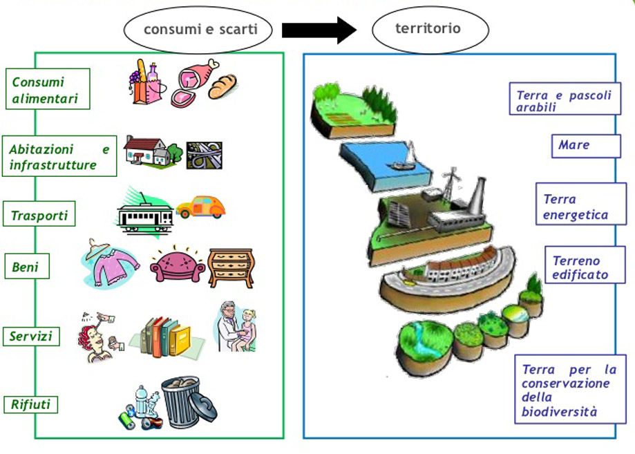 Per calcolare l’impronta ecologica si mette in relazione la quantità di ogni bene consumato con una costante di rendimento espressa in Kg/Ha: il risultato è una superficie di terra consumata espressa in ettari. Si può esprimere l’impronta ecologica anche dal punto di vista energetico, considerando l’emissione di biossido di carbonio (CO2) espressa in tonnellate e, di conseguenza, la quantità di terra necessaria per assorbirla.