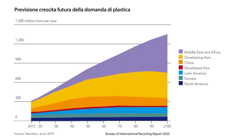 L’International Energy Agency prevede che il contributo dell’industria petrolchimica alla crescita complessiva della domanda di petrolio aumenterà ulteriormente di 2,5 volte negli anni fino al 2040 rispetto agli anni dal 2000 al 2017. In effetti, ci si aspetta che questa sia l’unica principale fonte di domanda che subirà un accelerazione. Gli analisti prevedono inoltre che quella plastica “invisibile” (ovvero componenti di infrastrutture digitali, gadget elettronici e smartphone) ne diventerà una nuova fonte, soprattutto per quanto riguarda il Medio Oriente, l’Africa e i Paesi asiatici in via di sviluppo. A seguire la Cina (che ha appena ribadito il suo rifiuto a ricevere i rifiuti provenienti dai Paesi occidentali, mentre la domanda di Europa e Stati Uniti rimarrà stabile su valori di gran lunga minori.