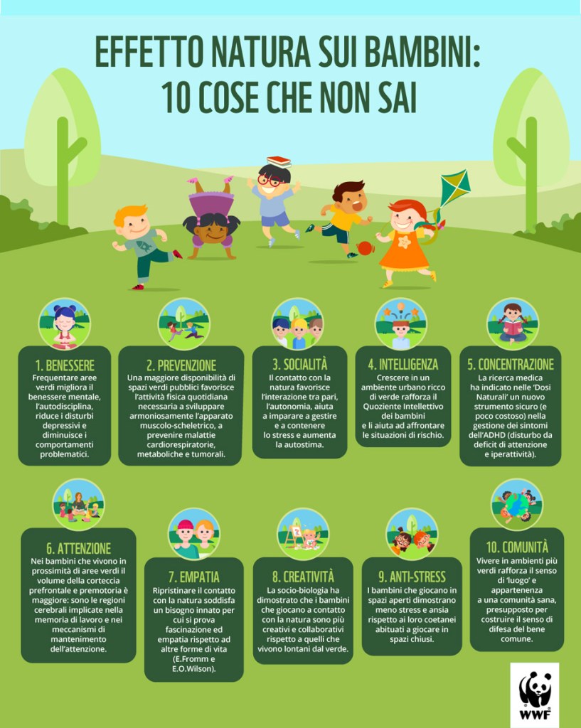 Gli effetti benefici della natura dunque sono molteplici e fondamentali nella crescita di un bambino: il Wwf, raccogliendo le evidenze scientifiche e pedagogiche più recenti, ha elencato i 10 fattori che vengono migliorati o sviluppati dal contatto con il verde. Il primo fattore è il benessere: frequentare aree verdi influisce positivamente sulla mente, sull’autodisciplina e riduce comportamenti depressivi. Il secondo è la prevenzione perché «una maggiore disponibilità di spazi verdi pubblici favorisce l’attività fisica quotidiana necessaria a sviluppare armoniosamente l’apparato musico-scheletrico, a prevenire malattie cardiorespiratorie, metaboliche e tumorali». Il contatto con la natura favorisce l’interazione tra le persone, quindi anche la socialità, aiuta a contenere lo stress e aumenta l’autostima.