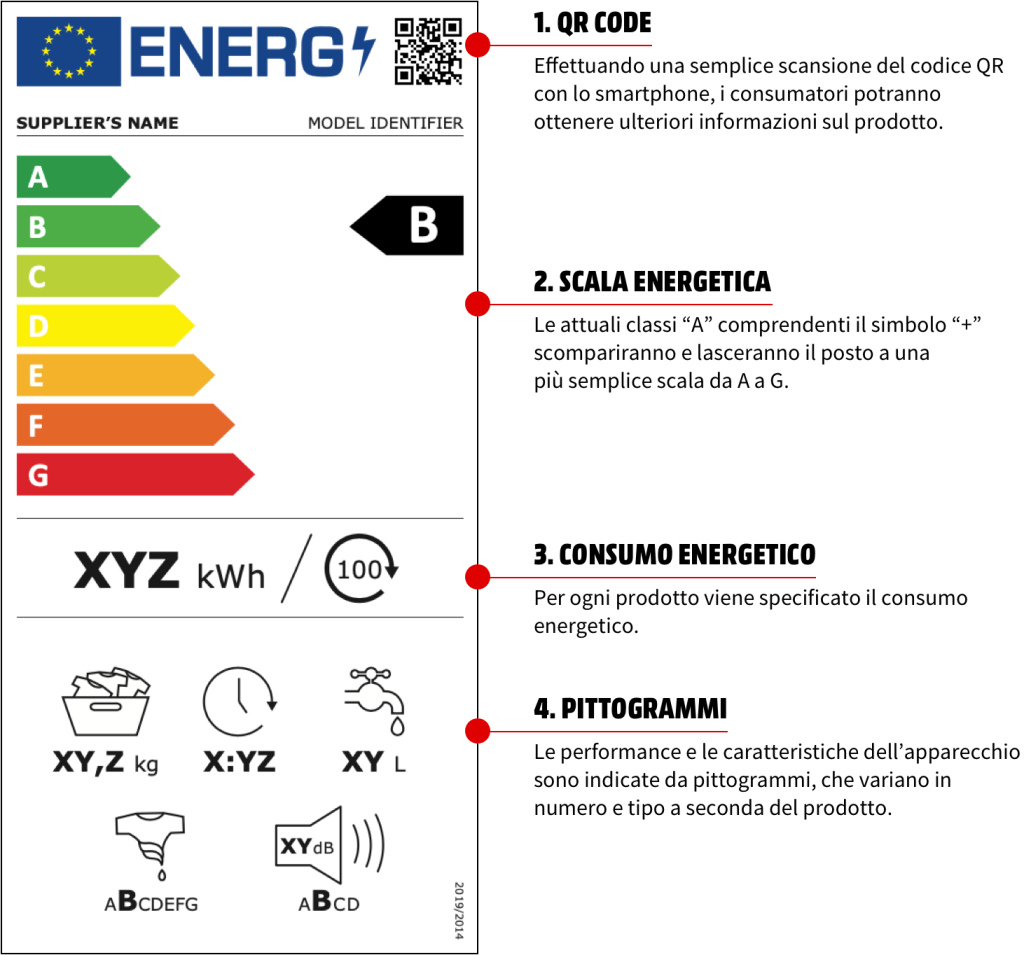 L’aspetto estetico più evidente che differenzia le etichette nuove da quelle precedenti è la presenza di un QR Code nell’angolo in alto a destra: inquadrandolo con lo smartphone si ha accesso a informazioni aggiuntive e ufficiali (non commerciali) su ogni modello di elettrodomestico. Il consumo energetico riportato, poi, è specifico per ogni famiglia di prodotto: per lavatrici, lavastoviglie e lavasciuga il consumo per 100 cicli di lavaggio, quello annuo per i frigoriferi e quello per mille ore di utilizzo per gli schermi e le lampadine. Queste performance e caratteristiche sono indicate mediante pittogrammi, icone che compaiono nella parte inferiore dell’etichetta: il numero e il tipo di pittogrammi possono variare a seconda dell’apparecchio.