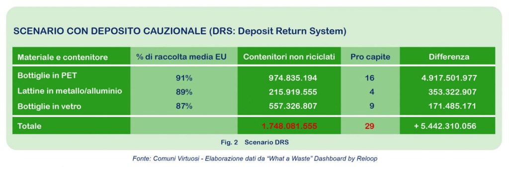 La riduzione più consistente si avrebbe per le bottiglie in PET che dai quasi 5 miliardi di unità non riciclate, scenderebbe a 974 milioni. Ovvero da quasi 100 bottiglie sprecate pro capite a sole 16.