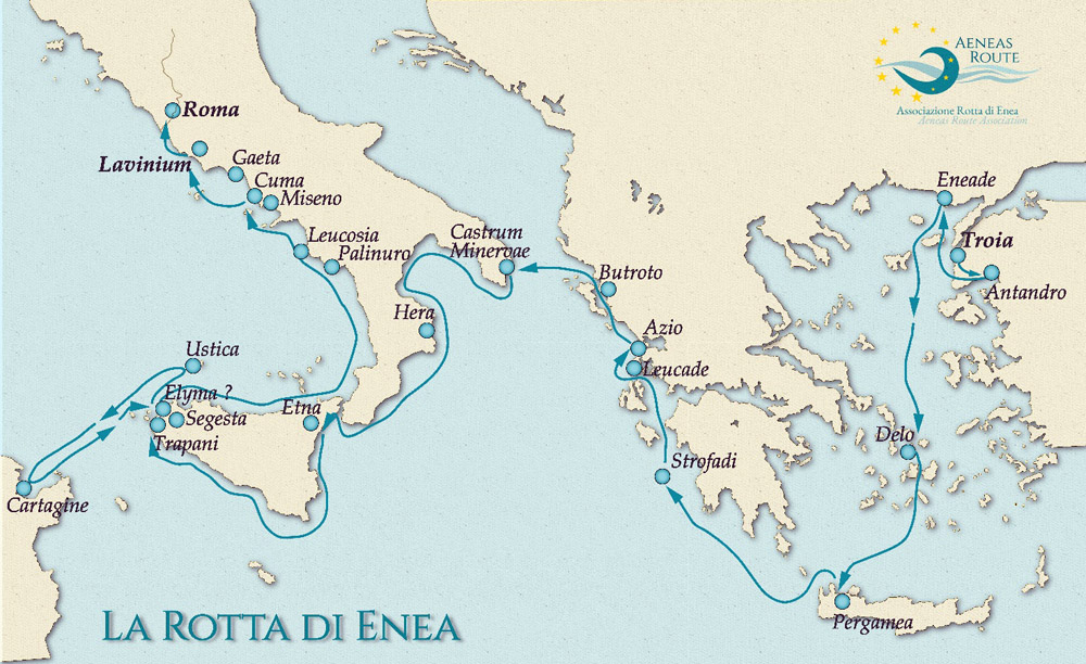 Il mitico viaggio dell’eroe troiano, cantato da Virgilio e protagonista del mito delle origini di Roma, è il 45° itinerario culturale riconosciuto a livello europeo. Il primo nel 1987 è stato il Cammino di Santiago. Attraversa 5 paesi mediterranei (Turchia, Grecia, Albania, Tunisia e Italia) in un percorso che in Italia interessa 6 Regioni: Puglia, Sicilia, Calabria, Campania e Lazio.