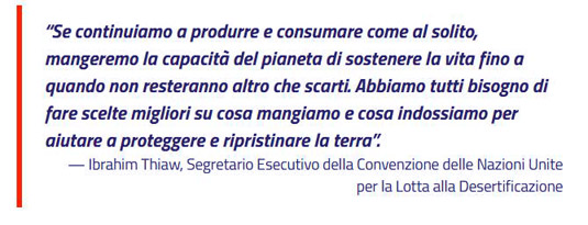 Si legge sul sito UNCCD che per avere abbastanza terra produttiva per soddisfare la domanda di dieci miliardi di persone entro il 2050, gli stili di vita devono inevitabilmente cambiare.