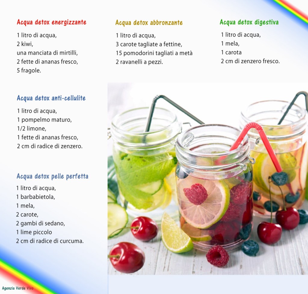 Da provare diversi mix come fragole, limone e menta o cetriolo, lime e pesca o ciliegie, lamponi e zenzero, secondo l’esigenza del momento oppure secondo frutta e verdure a disposizione in frigo.
