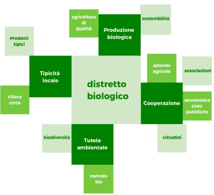 Un Bio-distretto è un’area geografica dove agricoltori, cittadini, operatori turistici, associazioni e pubbliche amministrazioni stabiliscono un accordo per la gestione sostenibile delle risorse locali, partendo dal modello biologico di produzione e consumo (filiera corta, gruppi di acquisto, mense pubbliche bio). Nel Bio-distretto, la promozione dei prodotti biologici si coniuga indissolubilmente con la promozione del territorio e delle sue peculiarità.Nel Bio-distretto, infatti, sono messe in rete le risorse naturali, culturali, produttive di un territorio, che sono valorizzate da politiche locali orientate alla salvaguardia dell’ambiente, delle tradizioni e dei saperi locali.