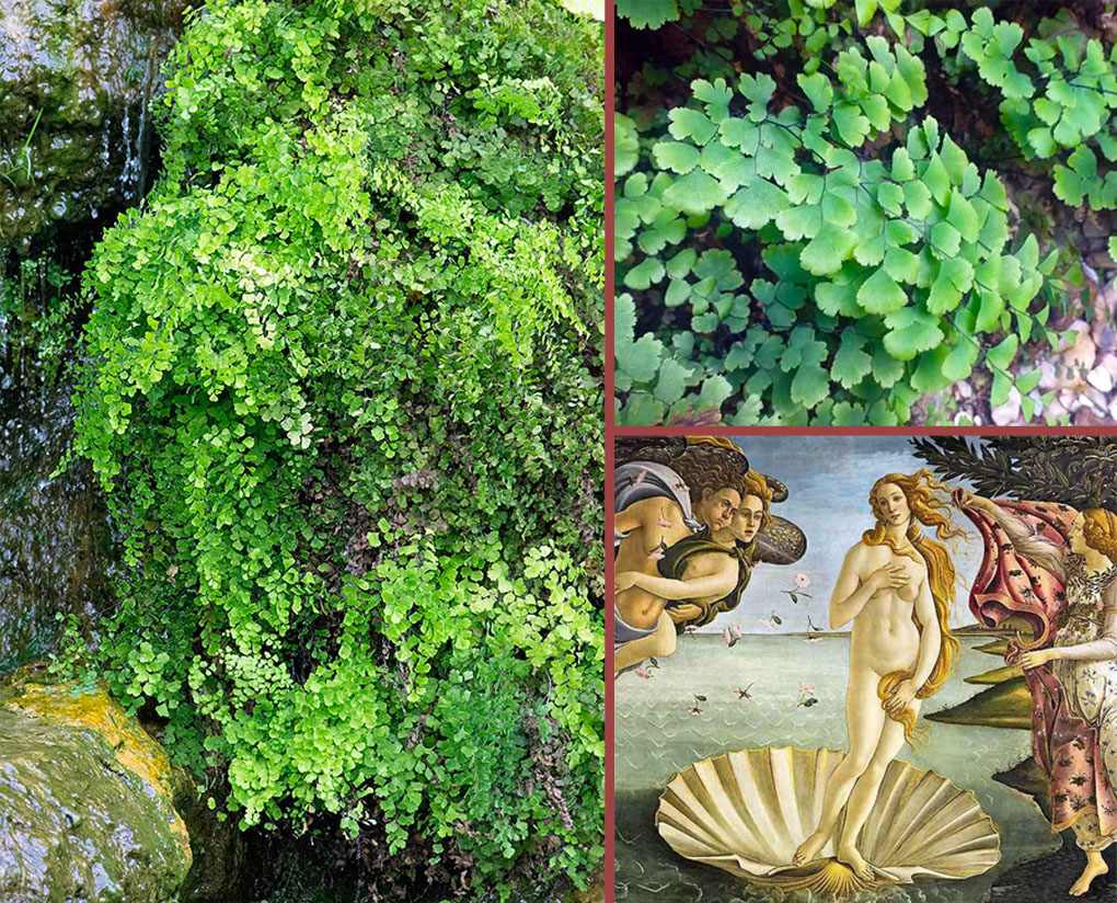 Il nome deriva dal fatto che le foglie non si bagnano immerse nell’acqua come la chioma di Venere, la Dea nata asciutta dalle acque. É una pianta molto citata in letteratura, Pavese la amava molto, forse perché frequente nelle sorgive delle langhe, ma anche Hesse. È legata alla storia degli argonauti ed alla ninfa Driope. Crescendo in luoghi ombrosi e umidi e consacrata a Plutone. Rappresenta simbolicamente il Segreto, la Modestia e la Discrezione anche a causa delle sue abitudini di crescita. Un tempo era molto comune, ma essendo molto esigente in fatto di habitat oggi é molto meno diffusa e resiste ancora solo in zone ombrose, all’imbocco di grotte umide e comunque vicina all’acqua.