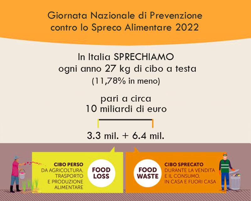 La Giornata Nazionale di Prevenzione contro lo spreco alimentare 2022 vede l’Italia come il Paese che ha adottato i comportamenti migliori per prevenire gli sprechi: l’indagine Waste Watcher International sui dati 2021 (di 8 Paesi del mondo: Stati Uniti, Cina, Regno Unito, Canada, Russia, Germania, Spagna e Italia) rileva che 222.125 tonnellate di cibo si sono “salvate” dalla spazzatura nel nostro Paese che, comunque, registra uno spreco di circa 27 kg di cibo a testa (529 grammi a settimana), corrispondente a solo l’11,78% in meno (3,6 kg) rispetto all’anno precedente e pari a quasi 10 miliardi di euro. Questi si ottengono sommando al valore domestico di circa 6.4 miliardi di euro le perdite in campo e lo spreco nel commercio e distribuzione che ammontano a 3.284.280.114 di euro.