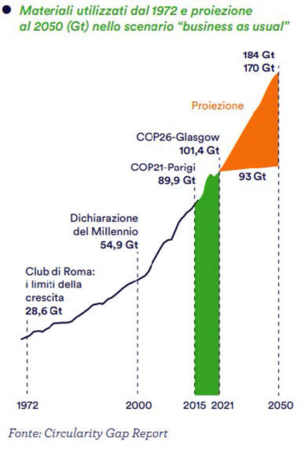 Occore però, per l’Italia come per il resto del mondo, valutare non solo le percentuali del recupero rispetto ai rifiuti prodotti ma anche la quantità assoluta dei consumi e della produzione dei rifiuti. Sul livello globale, riferisce il Rapporto, i dati consuntivi e previsionali sull’incremento del consumo di materie prime sono a dir poco allarmanti: “negli ultimi cinque anni i consumi sono cresciuti di oltre l’8% (da 92,8 a 100,6 miliardi di tonnellate – Gt), a fronte di un incremento del riutilizzo di appena il 3% (da 8,4 a 8,6 Gt). Tra il 2018 e il 2020 il tasso di circolarità è sceso dal 9,1 all’8,6% (Circularity Gap Report). Questo andamento negativo dipende dall’aumento dei consumi, che negli ultimi cinque anni sono cresciuti di oltre l’8% (da 92,8 a 100,6 miliardi di tonnellate – Gt), a fronte di un incremento del riutilizzo di appena il 3% (da 8,4 a 8,6 Gt). Per creare beni e servizi è stato dunque sfondato il muro dei 100 Gt di materie prime consumate in un anno e più della metà di questa enorme massa di materiali è stata impiegata per creare prodotti di breve durata. Recuperiamo meno del 9% del mare di risorse che ogni anno strappiamo alla Terra. L’uso di materiali sta accelerando a una velocità superiore alla crescita della popolazione: stiamo cioè andando – a livello globale – in direzione opposta a quella indicata dal Green Deal…”