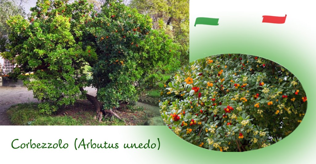 Arbutus unedo. Il Corbezzolo o Albatro é una bella pianta arbustiva che fiorisce alla fine dell’autunno di piccoli fiori bianchi a campanella. Contemporaneamente sulle sue fronde maturano i bei frutti rossi la cui polpa gialla ha sapore lievemente acidulo. Quest’albero non perde mai le foglie, di un bel verde scuro, così, in inverno su di esso insistono il candido bianco, il rosso carico ed il verde intenso; é per questo che nel risorgimento assurse a simbolo patriottico italiano.
