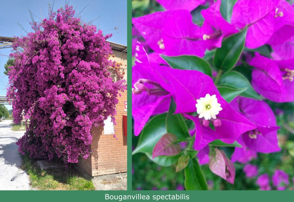 La Bouganvillea spectabilis, originaria del Brasile, raggiunge altezze degne di nota e cresce molto rapidamente. Le foglie sono ovali e pelose. Le brattee sono di un rosa/lilla molto acceso.