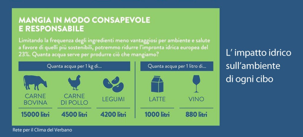 Ed è anche possibile comparare alcuni tra i cibi più comuni. Assunta questa conoscenza si può decidere di seguire semplici regole per non sprecare acqua, che vanno dall’annaffiare la sera perché l’acqua non evapora al mangiare meno carne di manzo, che è quella per la cui produzione si consuma più acqua in assoluto.
