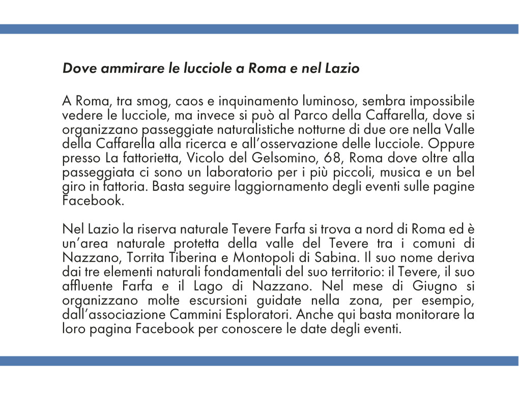 Pochi spettacoli della natura sono magici come il bagliore delle lucciole. Uno show di luci in scena nelle notti della prima estate. Se ne vedono sempre meno, decimate dalla perdita di habitat, dall’inquinamento luminoso e dai pesticidi, ma possiamo ancora aiutarle a riprendersi la notte e ad ammirarle. Dove a Roma e nel Lazio