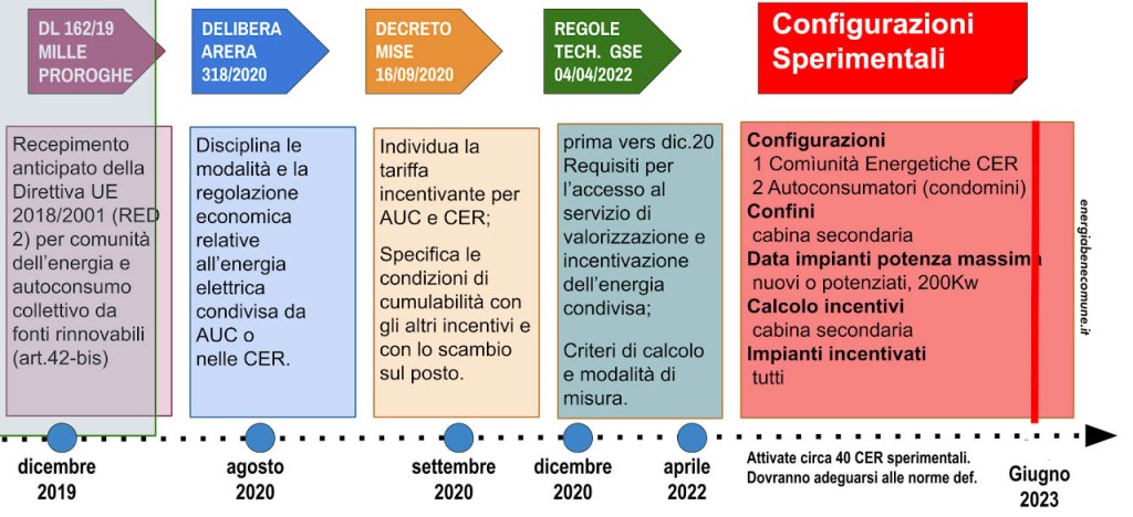 Le Comunità Energetiche Rinnovabili (CER) sono attualmente regolate da una normativa provvisoria, che consente una sperimentazione limitata a piccole organizzazioni (poche migliaia di abitanti intorno alle cabine secondarie), con bassa produzione e condivisione di energia rinnovabile (impianti fino a 200 Kw). La sperimentazione è stata resa possibile grazie all’approvazione dell’art. 42 bis del decreto cosiddetto milleproroghe, in vigore dal 1/3/2020, e si applicherà fino all’entrata in vigore della normativa definitiva, che dovrebbe avvenire a breve dopo l’approvazione del decreto del MASE (Ministero dell’ambiente e della sicurezza energetica) che si pronuncerà anche sugli incentivi per le configurazioni dell’autoconsumo diffuso.