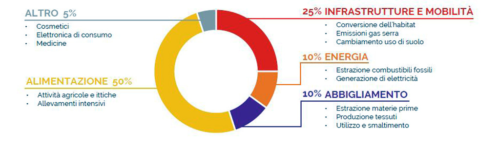 Le attività che contribuiscono alla perdita di biodiversità si verificano in tutte le principali catene del valore dell’economia globale. In particolare, sono quattro i settori responsabili di circa il 90% della pressione sulla biodiversità e sono: alimentazione, infrastrutture e mobilità, energia e moda.