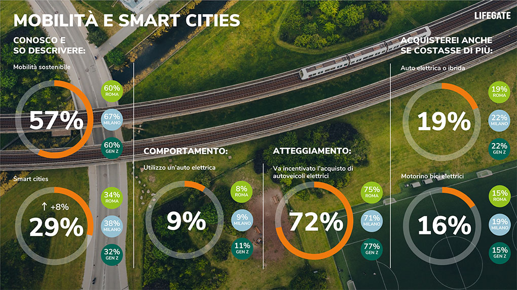 Solo il 60% del campione di intervistati dal 9° Osservatorio Nazionale sullo stile di vita Sostenibile di LifeGate a Roma e il 67% di quelli a Milano dichiarano che gli è già capitato di sentire l’espressione “mobilità sostenibile”, a fronte di altre come “Riscaldamento globale” (85% Roma, 83% Milano), ” Energia rinnovabile” (79% Roma, 80% Milano), “Crisi climatica” (81% Roma, 82% Milano).
